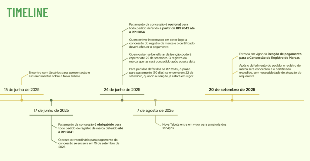 O INPI vai aplicar a nova tabela de taxas no dia 07 de agosto de 2025. Já a isenção da taxa final de concessão valerá para pedidos deferidos a partir de 20 de setembro de 2025.